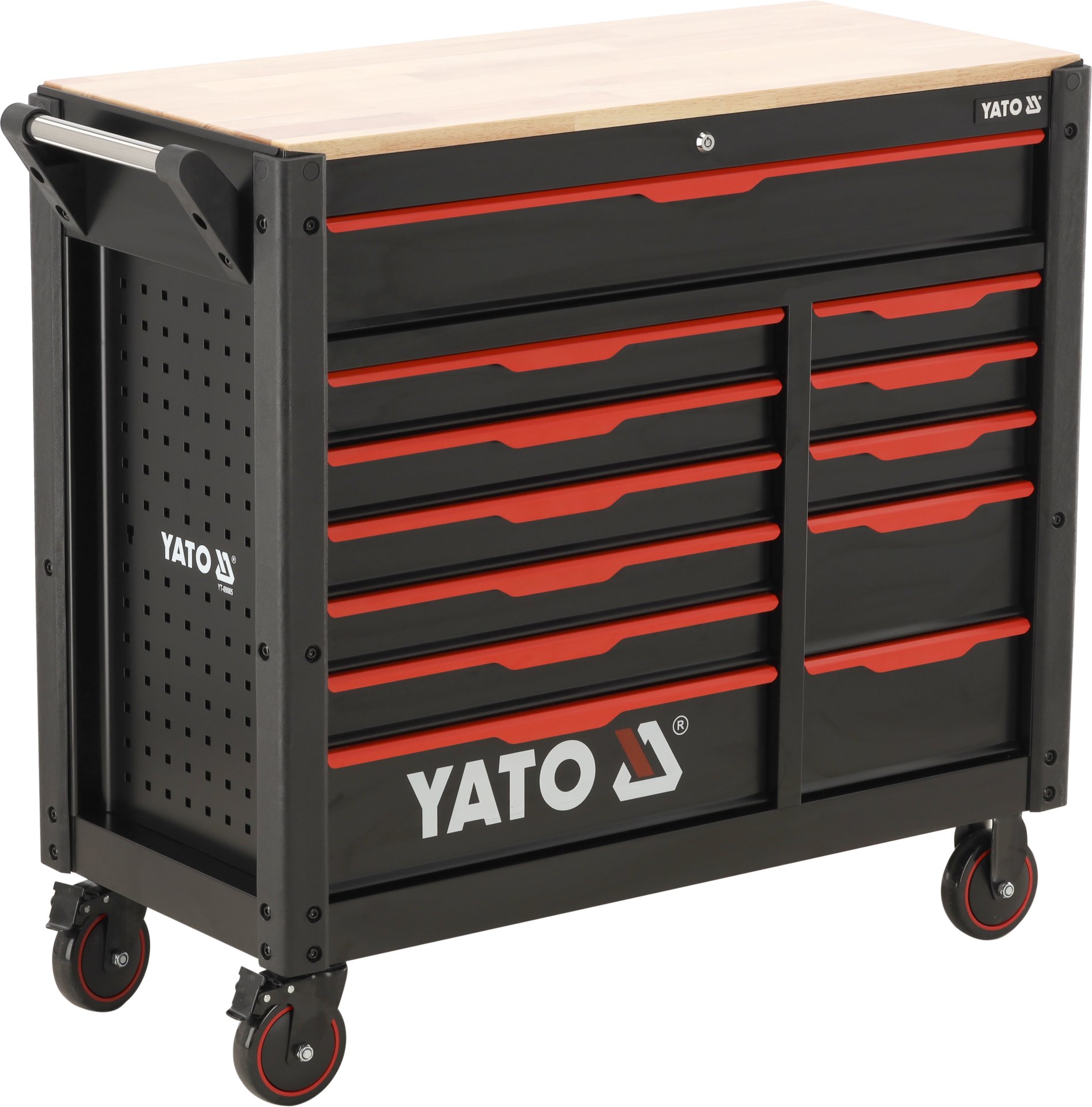 Opis: | Kolica za alat s 12 ladica, dizajniran za garaže i servisne postaje za vozila. Radna površina izrađena od kaučukovog drveta. Univerzalna perforacija omogućuje naknadnu ugradnju dodatnih elemenata. Kutni odbojnici štite od slučajnih oštećenja karoserije automobila. Karakteristike: - 12 ladica s kliznim ležajevima s kugličnim ležajevima - maksimalno opterećenje ladice: 45 kg - centralno zaključavanje (uključena 2 ključa) - ladice opremljene pojedinačnim bravama - materijal kućišta: čelični lim s praškastim premazom - materijal ploče stola: kaučukovo drvo - 4 kotačića promjera 125 mm, od kojih 2 imaju kočnicu - vanjske dimenzije (s kotačićima i ručkom): 1125x1000x480 mm - gornja dimenzija: 1025 × 455 × 20 mm Unutarnje dimenzije ladica: - 880 x 400 x 100 mm (središnja ladica) - 530 x 400 x 60 mm (5 ladica lijevo) - 530 x 400 x 140 mm (donja lijeva ladica) - 270 x 400 x 60 mm (3 ladice s desne strane) - 270 x 400 x 140 mm (2 donje ladice s desne strane) |
